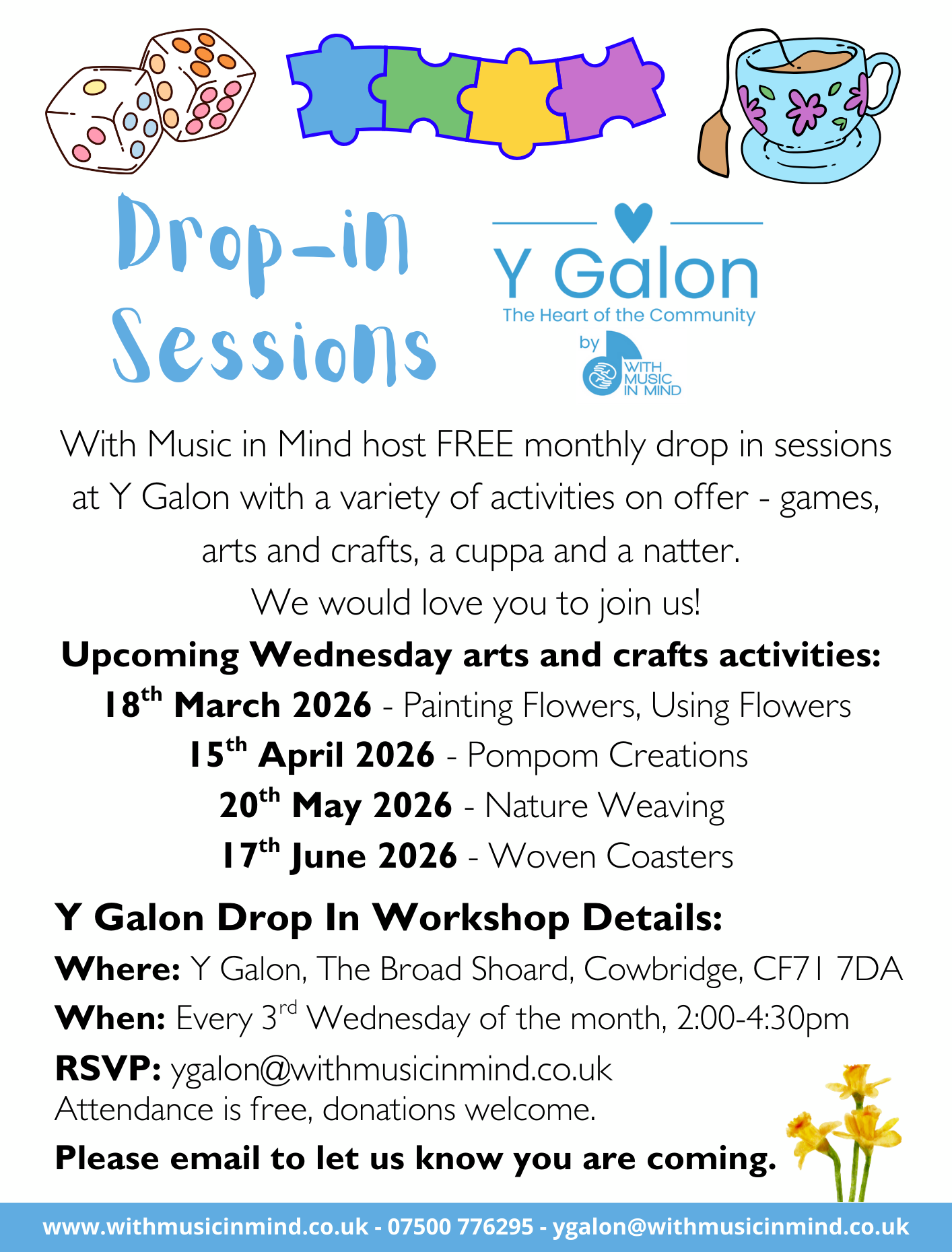 We've got lots more craft activities planned for the next few drop-in afternoons at Y Galon! Please let us know in advance if you'd like to take part in the craft so we can be sure to have enough supplies ready for everyone.